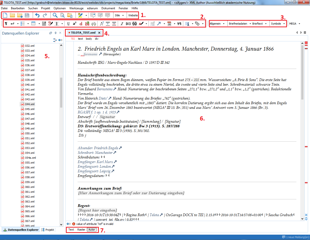 Das Programmfenster (siehe Abb.) ist dreigeteilt: oben befinden sich die drei Leisten (1–3) mit verschiedenen Werkzeugen. Links ist der Dateibaum (5) der Datenbank zu finden. Im rechten Fenster (6) können die einzelnen Dateien bearbeitet werden. Sind mehrere Dateien geöffnet, kann zwischen ihnen mit Hilfe der Tableiste (4) gewechselt werden. Unterhalb dieses Fensters kann die Ansicht des Dokumentes umgestellt werden (7).